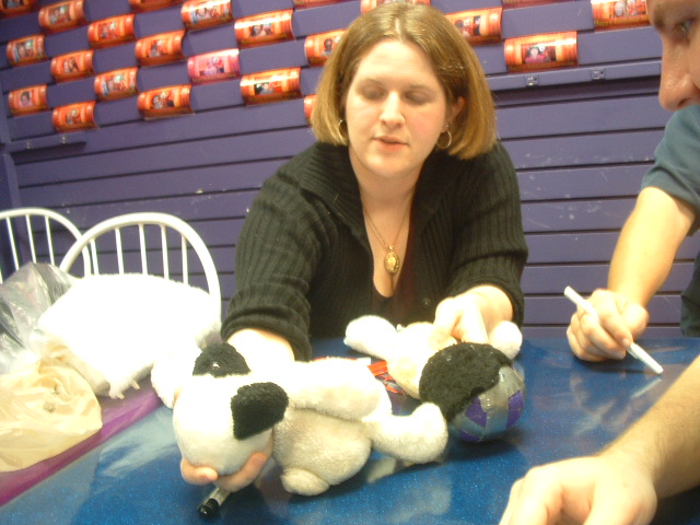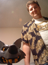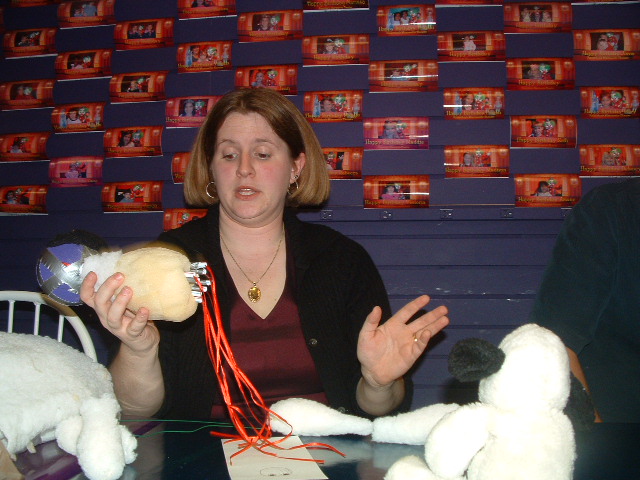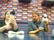 ![]() Dudley 3 Jamie shows off some of the puppet's mechanisms, while the prototype looks on. |